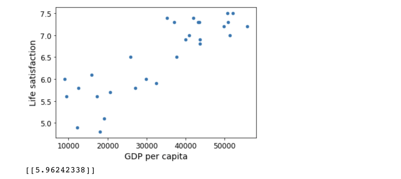 # 예제 코드 import matplotlib.pyplot as plt import numpy as np import pandas as pd import sklearn.linear_model # 데이터 적재 oecd_bli = pd.read_csv(datapath + "oecd_bli_2015.csv", thousands=',') gdp_per_capita = pd.read_csv(datapath + "gdp_per_capita.csv",thousands=',',delimiter='\t', encoding='latin1', na_values="n/a") # 데이터 준비 country_stats = prepare_country_stats(oecd_bli, gdp_per_capita) X = np.c_[country_stats["GDP per capita"]] y = np.c_[country_stats["Life satisfaction"]] # 데이터 시각화 country_stats.plot(kind='scatter', x="GDP per capita", y='Life satisfaction') plt.show() # 선형 모델 선택 model = sklearn.linear_model.LinearRegression() # 모델 훈련 model.fit(X, y) # 키프로스에 대한 예측 X_new = [[22587]] # 키프로스 1인당 GDP print(model.predict(X_new)) # 출력 [[ 5.96242338]]판다스의 read_csv 함수로 데이터를 불러옴