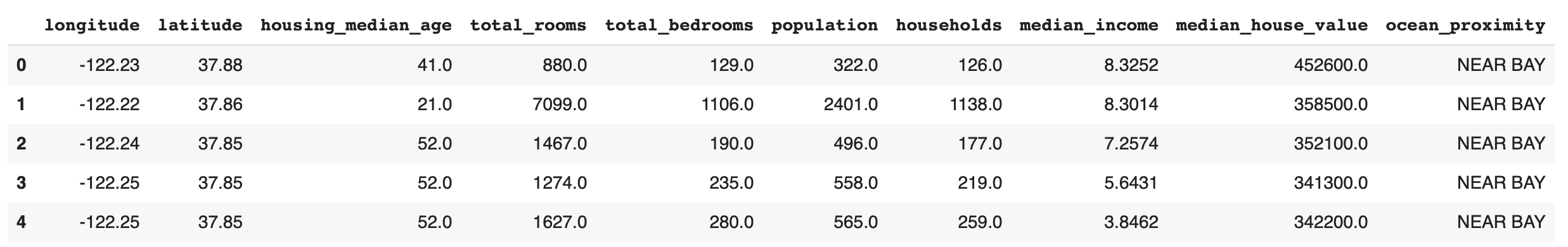 housing = load_housing_data() housing.head()head 함수: 처음 다섯개 행을 잘라서 보여줌
